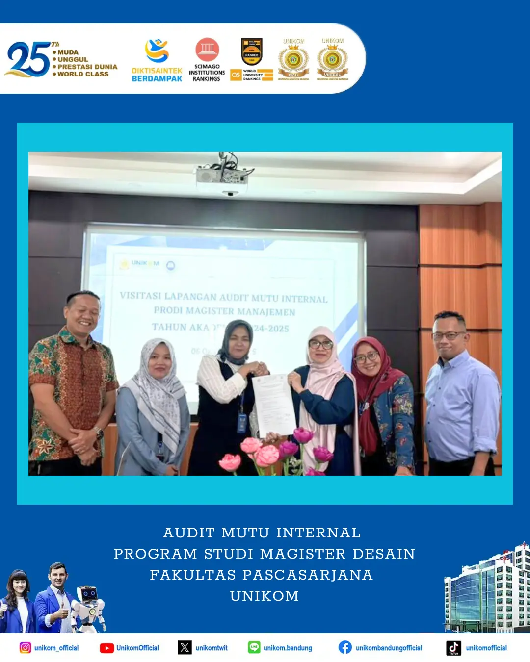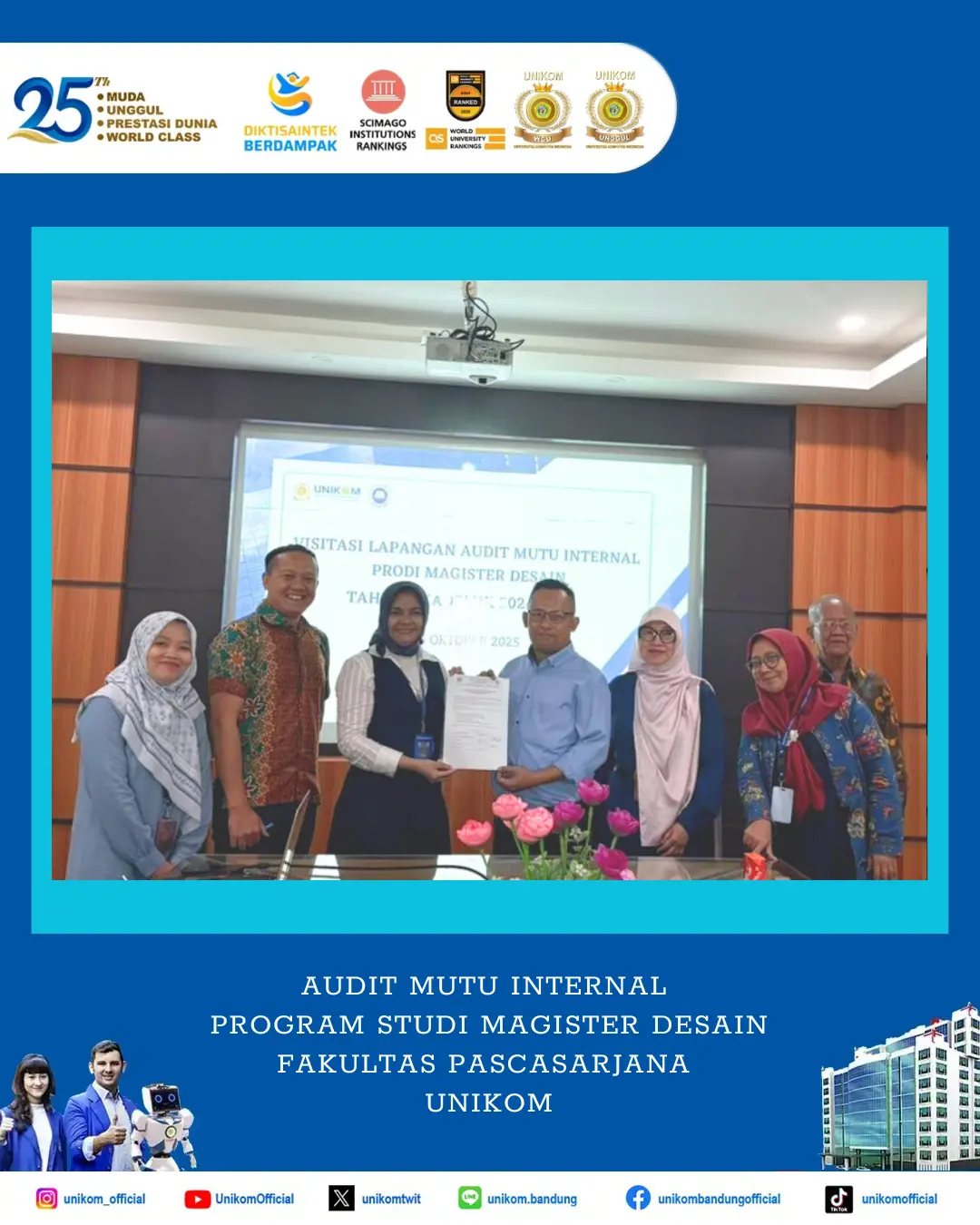 BANDUNG, UNIKOM – Pada Senin, 06 Oktober 2025, telah dilaksanakan Audit Mutu Internal Magister Desain Fakultas Pascasarjana UNIKOM oleh Direktorat Quality Assurance UNIKOM sebagai standar Tridharma Perguruan Tinggi dan Standar tata kelola Program Studi dengan auditor sebagai berikut: