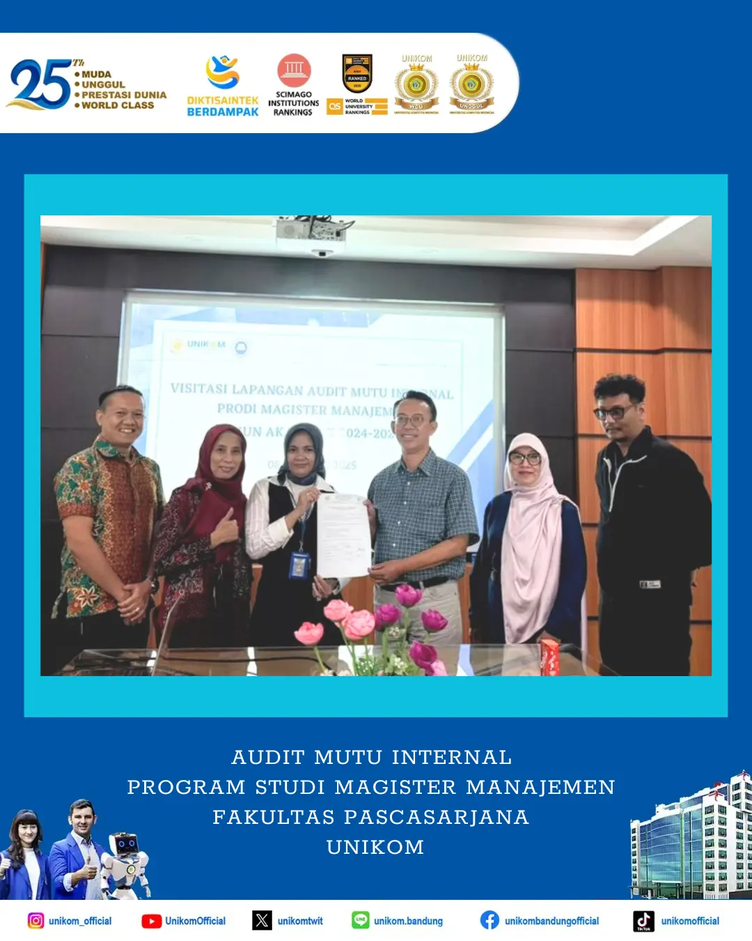 BANDUNG, UNIKOM – Pada Senin, 06 Oktober 2025, telah dilaksanakan Audit Mutu Internal Magister Manajemen Fakultas Pascasarjana UNIKOM oleh Direktorat Quality Assurance UNIKOM sebagai standar Tridharma Perguruan Tinggi dan Standar tata kelola Program Studi dengan auditor sebagai berikut: