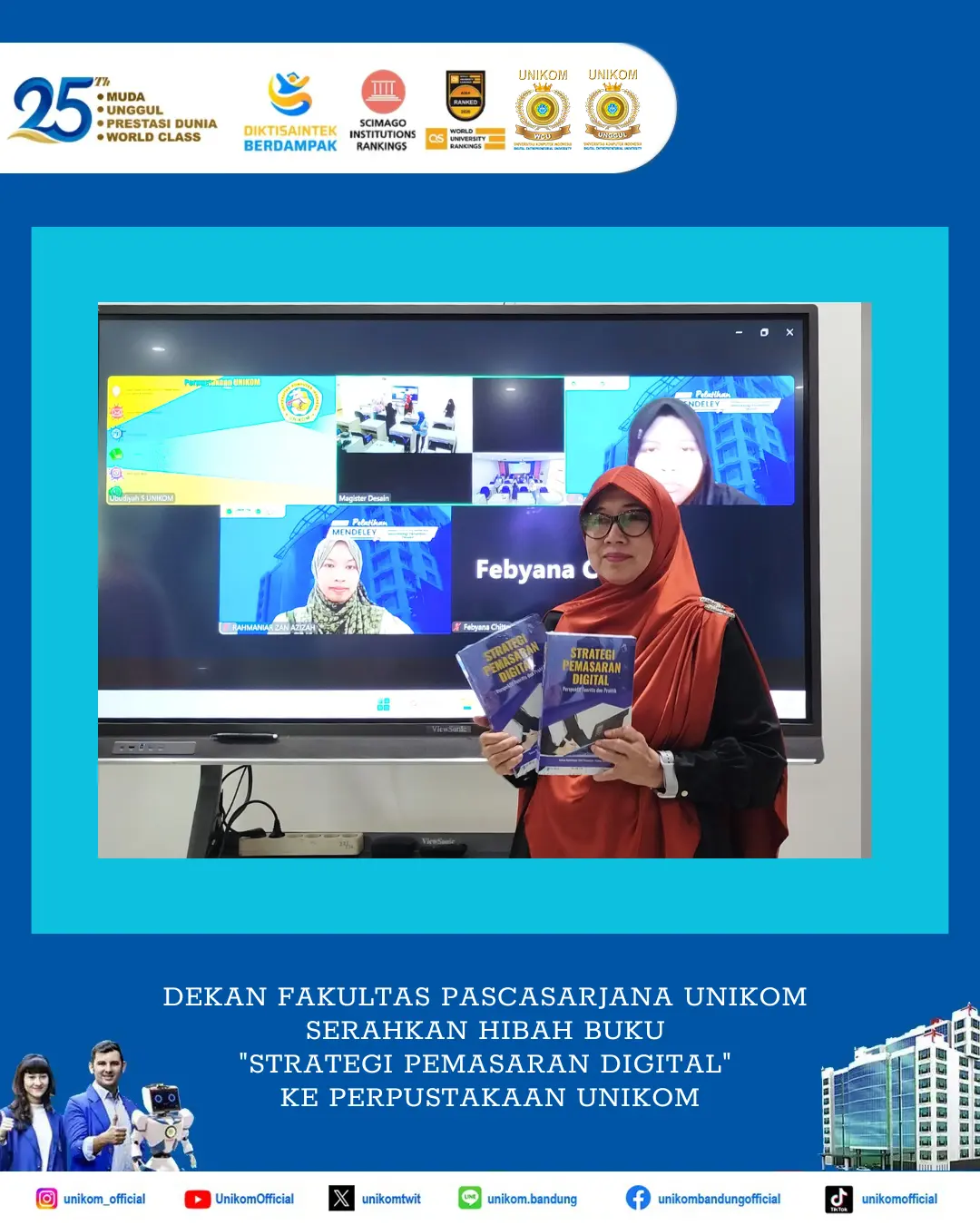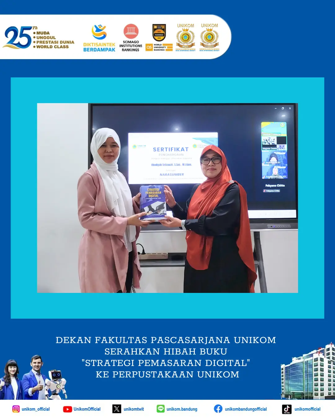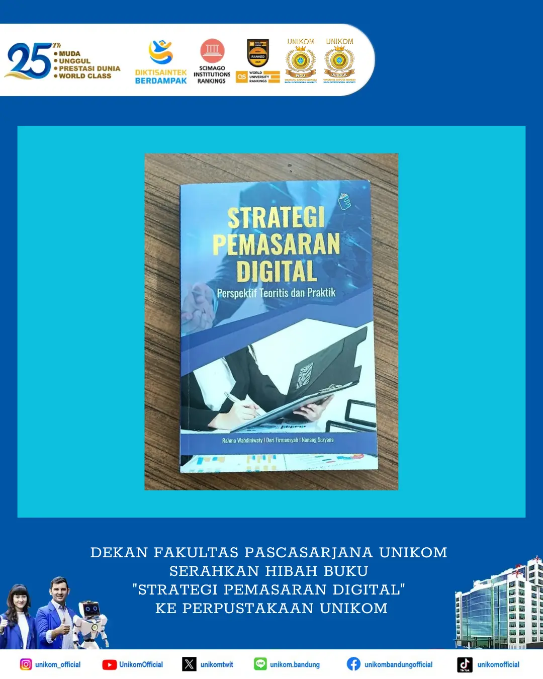 Buku yang dihibahkan berjudul “Strategi Pemasaran Digital : Perspektif Teoritis dan Praktik”. Buku ini diharapkan dapat menjadi sumber referensi yang berharga bagi seluruh sivitas akademika UNIKOM yang mendalami bidang pemasaran digital.