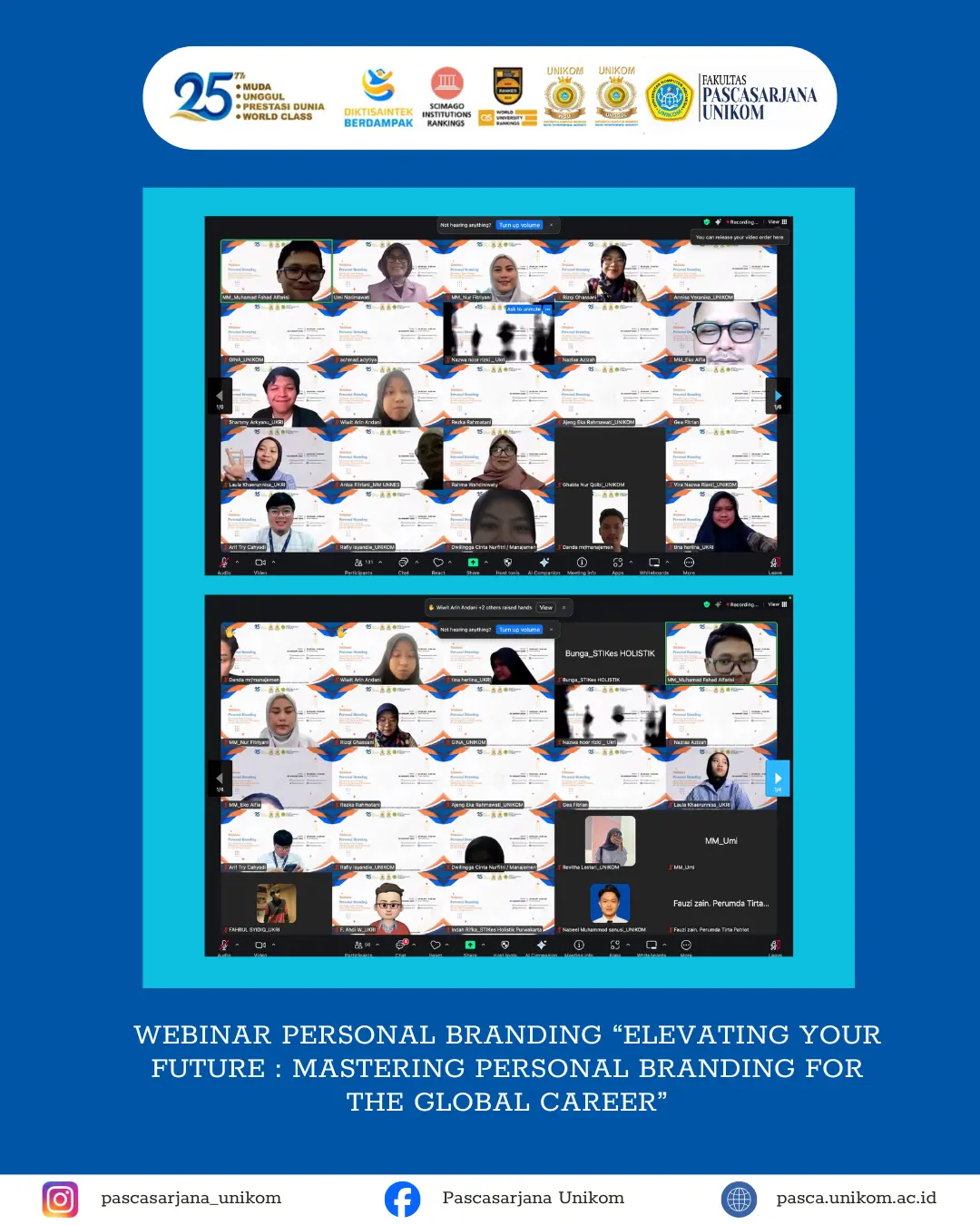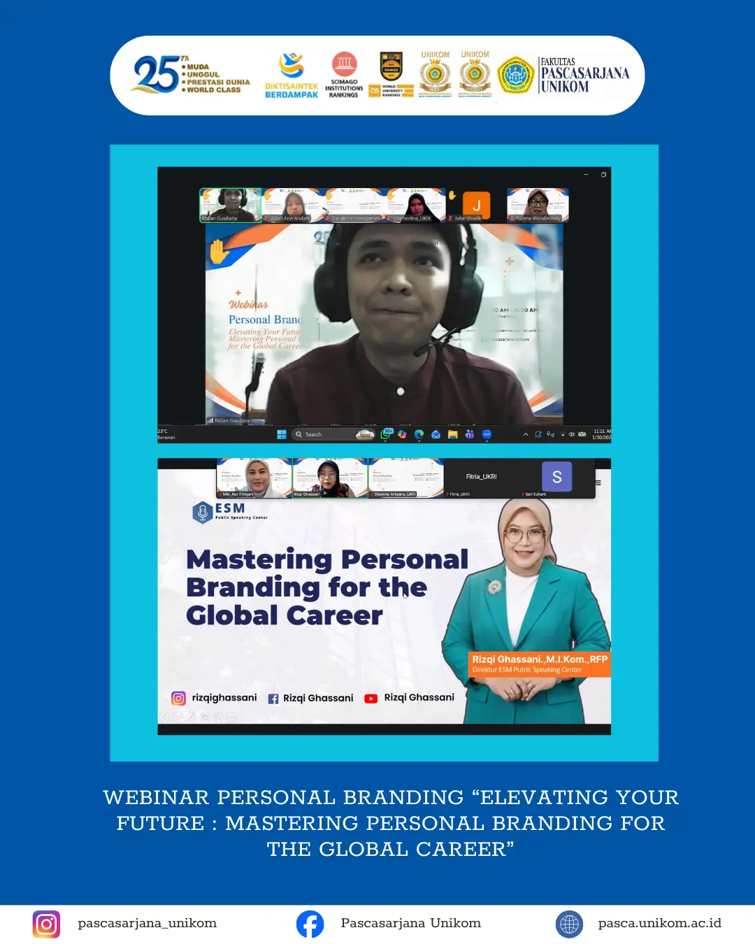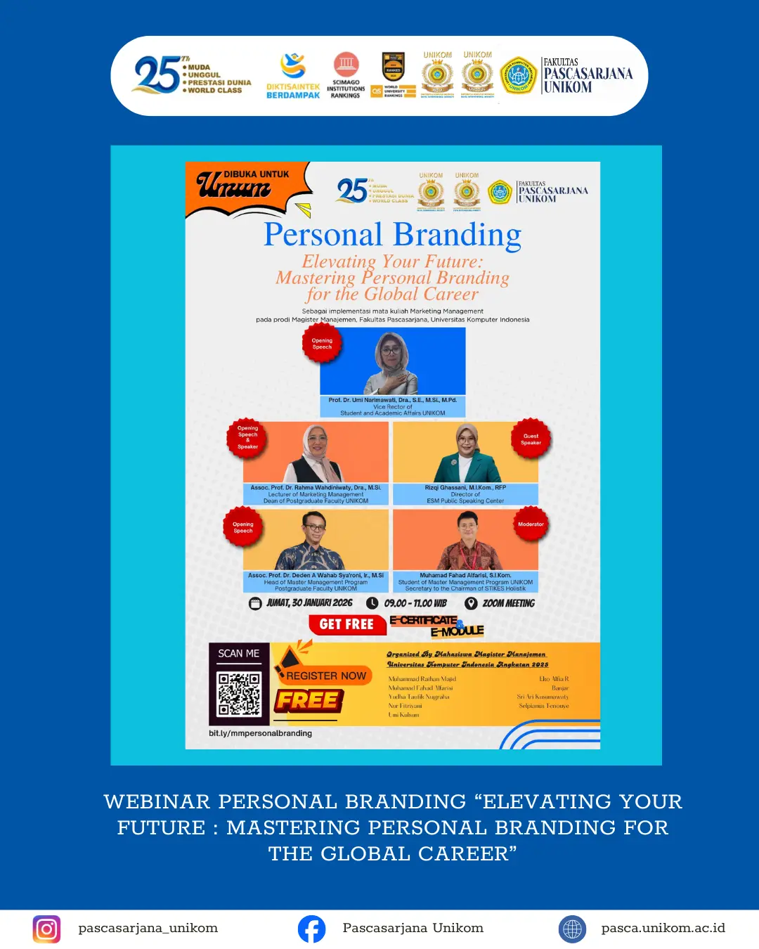 BANDUNG, UNIKOM – Dalam upaya membekali mahasiswa menghadapi tantangan dunia kerja yang semakin kompetitif, Fakultas Pascasarjana UNIKOM sukses menggelar webinar bertajuk “Elevating Your Future: Mastering Personal Branding for the Global Career” pada Jumat (30/01/2026).