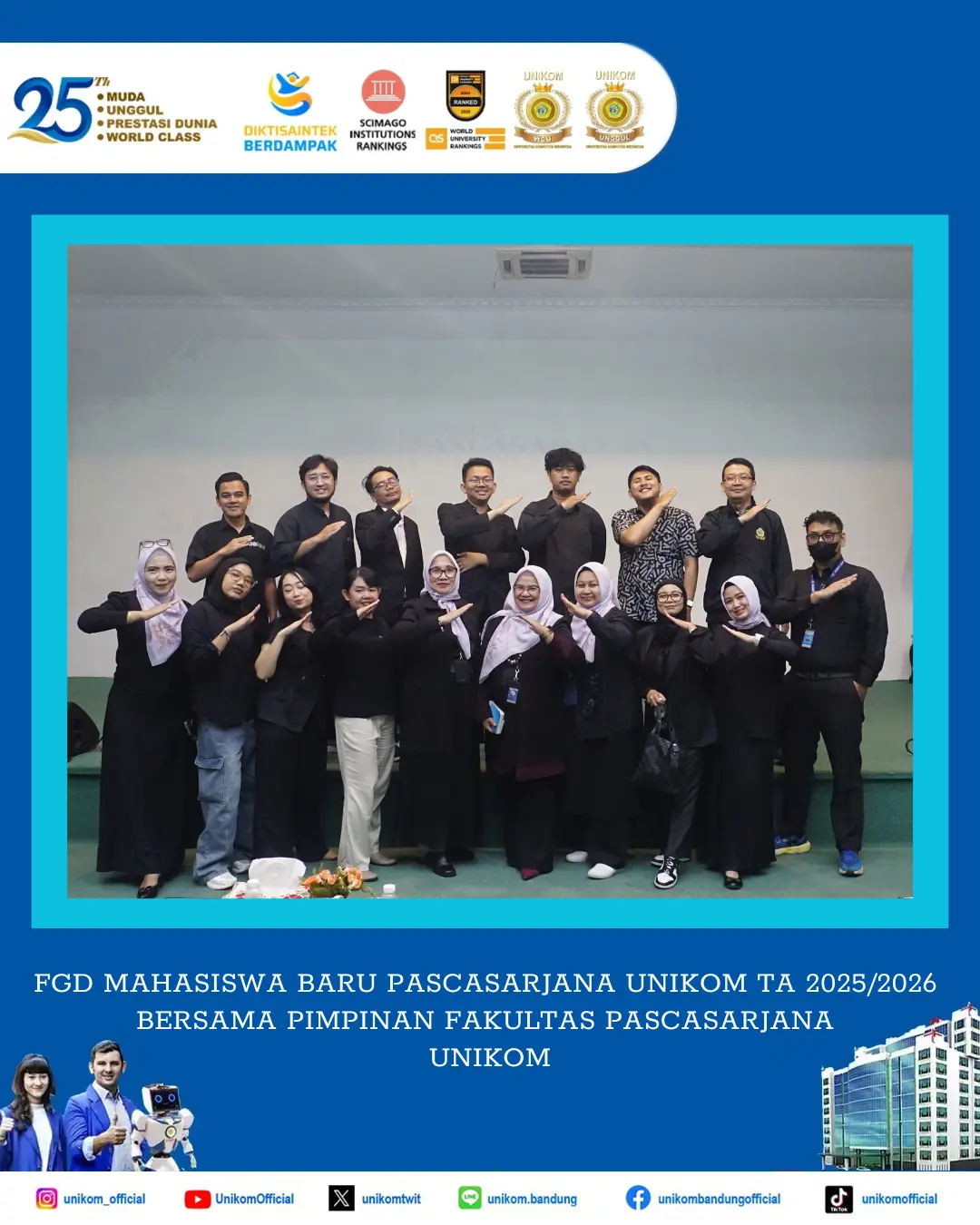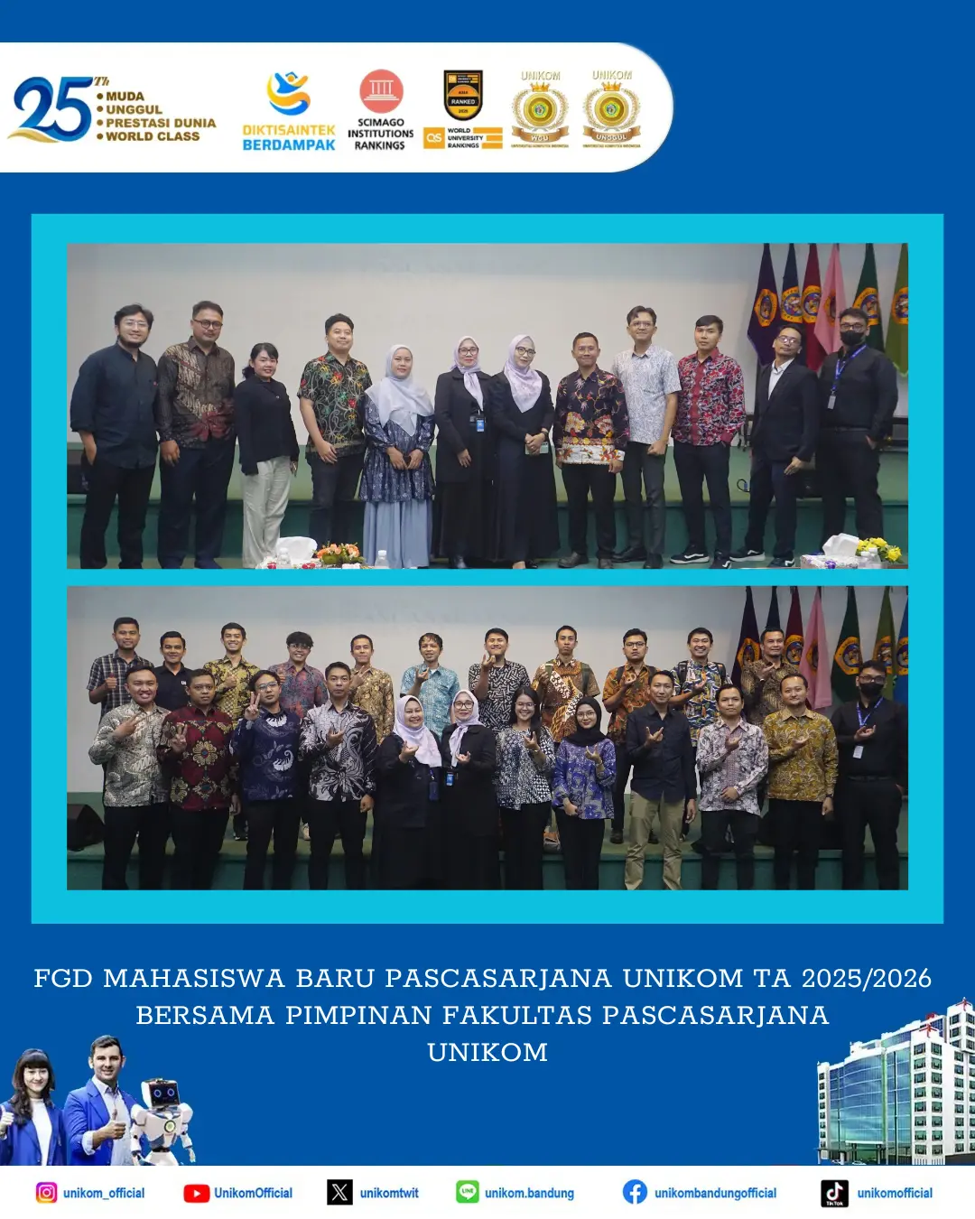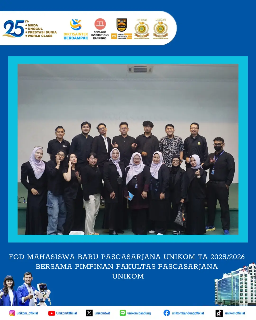 Acara ini merupakan sambutan Fakultas Pascasarjana UNIKOM kepada Mahasiswa Baru Fakultas Pascasarjana UNIKOM TA 2025/2026 untuk memastikan Mahasiswa Baru memiliki pemahaman yang komprehensif mengenai Program Studi dan Fakultas sebelum memulai perkuliahan. Mahasiswa Fakultas Pascassarjana UNIKOM merupakan kolega, untuk itu kegiatan ini hadir dalam rangka menciptakan atmosfer akademik baik antara Dosen dan Mahasiswa Baru TA 2025/2026. Momen kebersamaan ini kemudian diabadikan dengan foto bersama sebagai dokumentasi.
