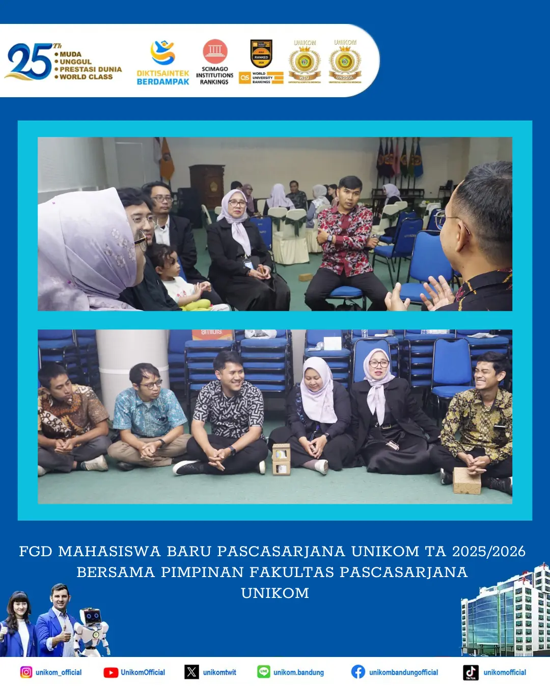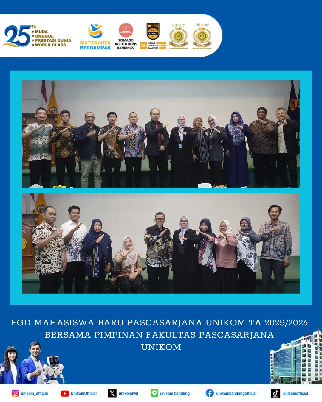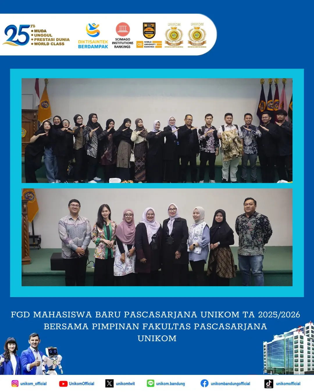 Acara ini merupakan sambutan Fakultas Pascasarjana UNIKOM kepada Mahasiswa Baru Fakultas Pascasarjana UNIKOM TA 2025/2026 untuk memastikan Mahasiswa Baru memiliki pemahaman yang komprehensif mengenai Program Studi dan Fakultas sebelum memulai perkuliahan. Mahasiswa Fakultas Pascassarjana UNIKOM merupakan kolega, untuk itu kegiatan ini hadir dalam rangka menciptakan atmosfer akademik baik antara Dosen dan Mahasiswa Baru TA 2025/2026. Momen kebersamaan ini kemudian diabadikan dengan foto bersama sebagai dokumentasi.