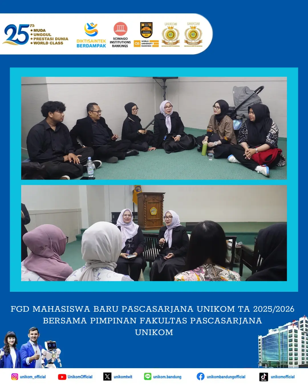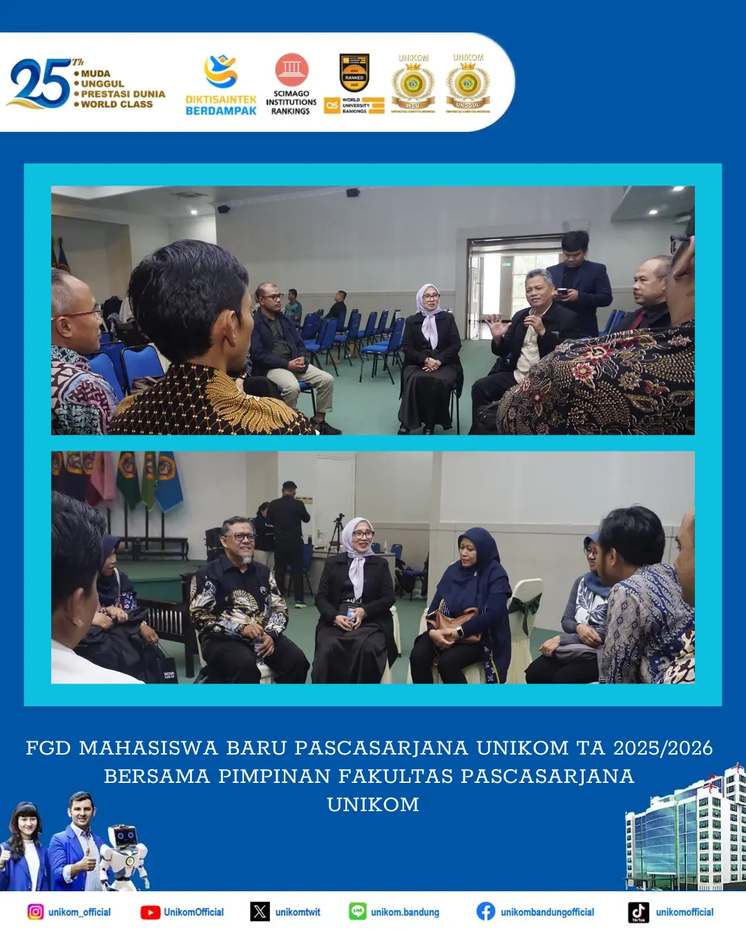 Forum Group Discussion ini merupakan kegiatan diskusi antara Mahasiswa Baru TA 2025/2026 bersama masing – masing Ketua Program Studi, Kakak Tingkat dan didampingi Dekan Fakultas Pascasarjana UNIKOM. Acara ini menjadi wadah dialog interaktif yang secara mendalam membahas seputar Fakultas Pascasarjana UNIKOM dan Program Studi di lingkungan Pascasarjana UNIKOM.