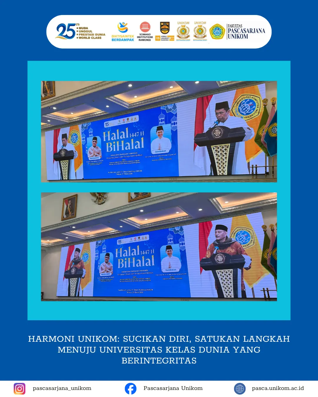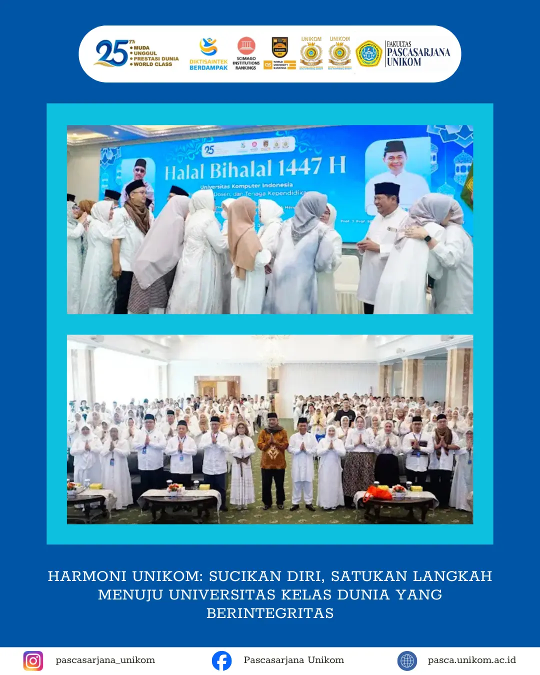 Bandung – UNIKOM, Selasa, 31 Maret 2026 Sivitas Fakultas Pascasarjana UNIKOM menghadiri acara Halal Bihalal 1447 H yang diselenggarakan di Auditorium Lantai 17 Smart Building UNIKOM. Mengusung tema “Harmoni UNIKOM: Sucikan Diri, Satukan Langkah Menuju Universitas Kelas Dunia yang Berintegritas” kegiatan ini menghadirkan KH. Drs. Yayat Ruhiyat Ar-Rasyid sebagai narasumber.