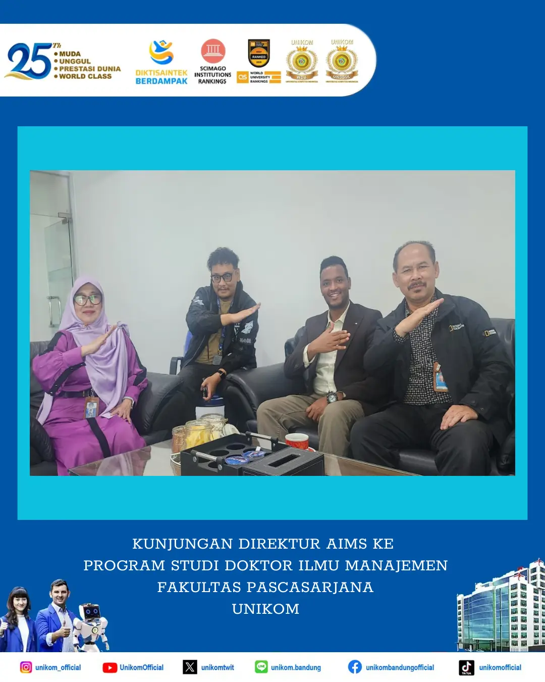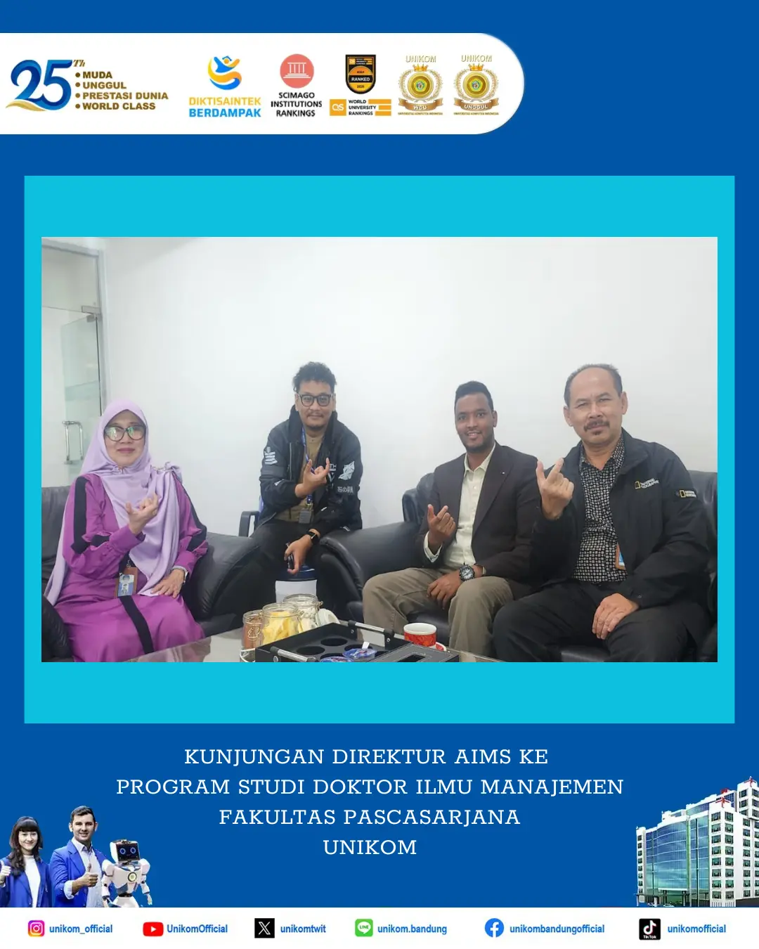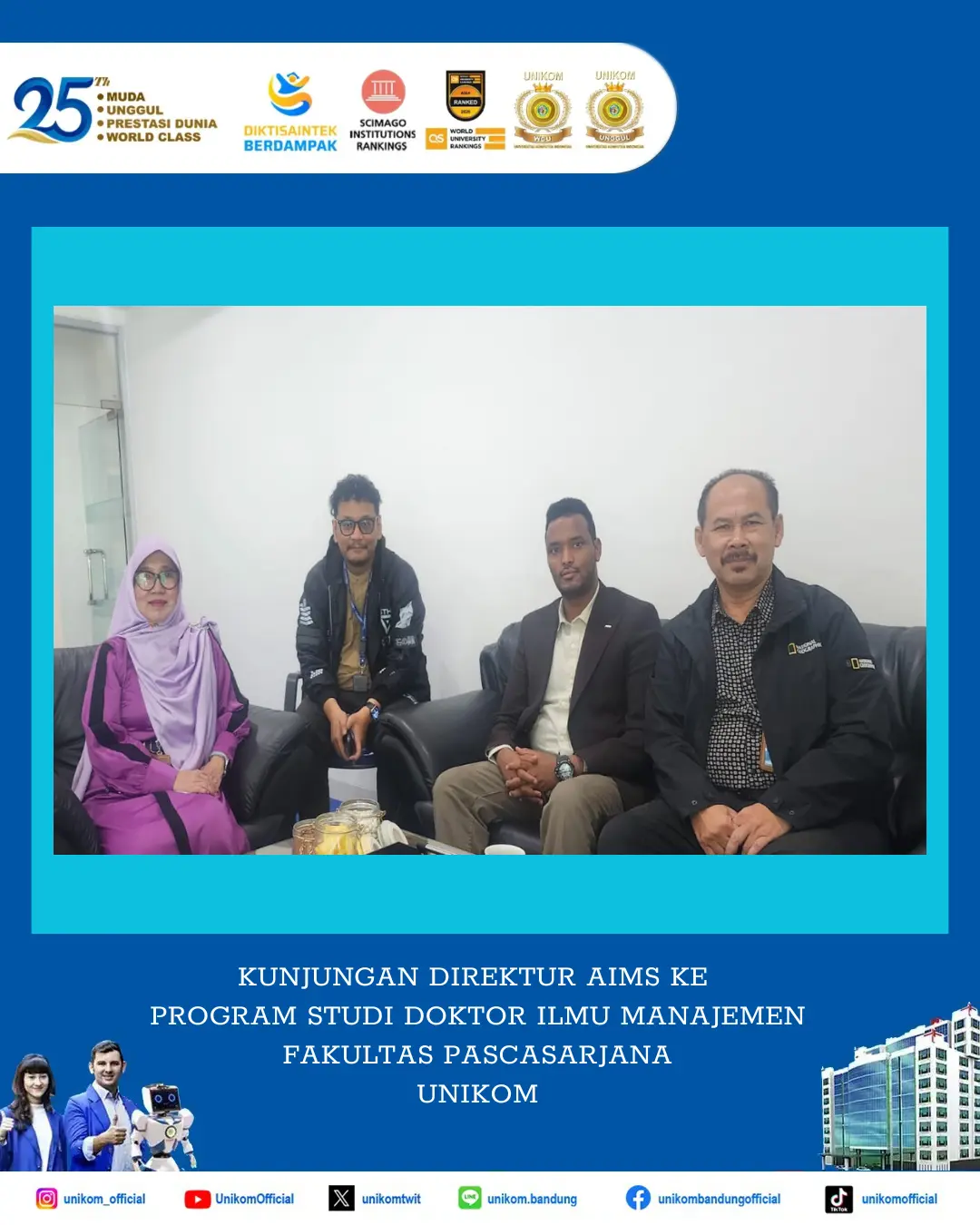 BANDUNG, UNIKOM – Program Studi Doktor Ilmu Manajemen UNIKOM menerima kunjungan Direktur African Institute for Multidisciplinary Studies (AIMS), Abdisamad Abdirahman Omar, Ph.D., pada Sabtu, 04 Oktober 2025 dalam rangka mempererat tali silaturahmi. Dekan Fakultas Pascasarjana UNIKOM, Assoc. Prof. Dr. Rahma Wahdiniwaty, Dra., M.Si. bersama Ketua Program Studi Doktor Ilmu Manajemen, Prof. Dr. Ir. H. M. Yani Syafei, M.T, CSBA. dan Koordinator Kemahasiswaan, Geraldi Catur Pamuji, S.Kom., M.Kom menyambut hangat kedatangan Direktur AIMS tersebut.